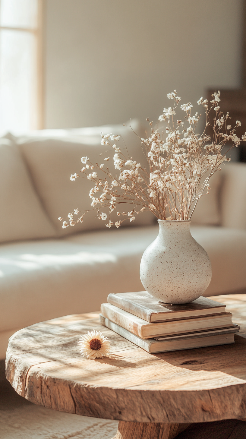 • Decorate with a ceramic bowl, dried flowers, and a small stack of books